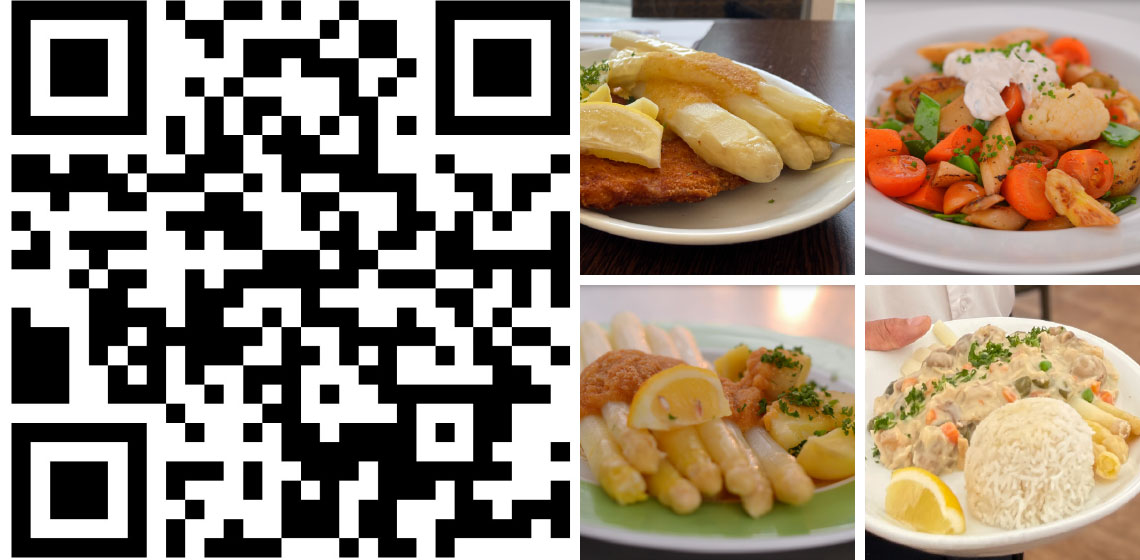 Zusätzlich gibt es jetzt auch die Möglichkeit, sich das gewünschte Menü zum Mitnehmen zu bestellen. Über diesen Link und QR-Code hier könnt ihr euer Spargelessen selbst zusammenstellen, die Bestellung zum gewünschten Abholzeitpunkt abschicken und dann fertig verpackt in unserem Spargelzelt an der Ausgabe, unserem Küchenpass abholen.
